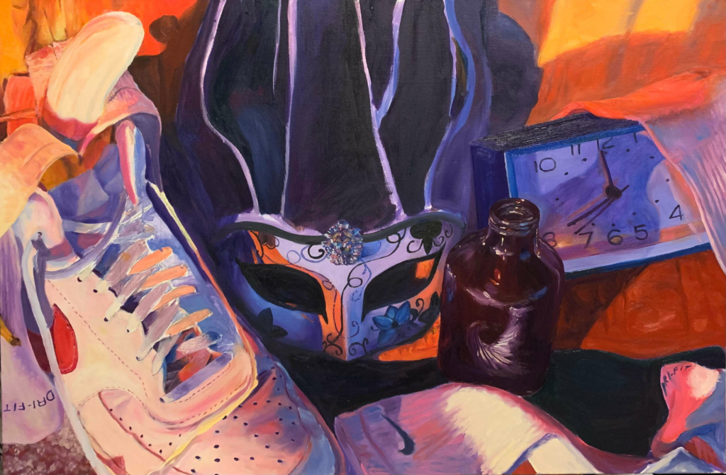 I calzini Nike nel mio lavoro compaiono già nel 2022 con un progetto di fotorealismo intitolato Masquerade. Questo dipinto esplora la mia visione della mascolinità attraverso una maschera flamboyant al centro della composizione, circondata da oggetti che consideravo maschili: una banana infilata in una scarpa, una bottiglia di birra vuota e dei calzini Nike.