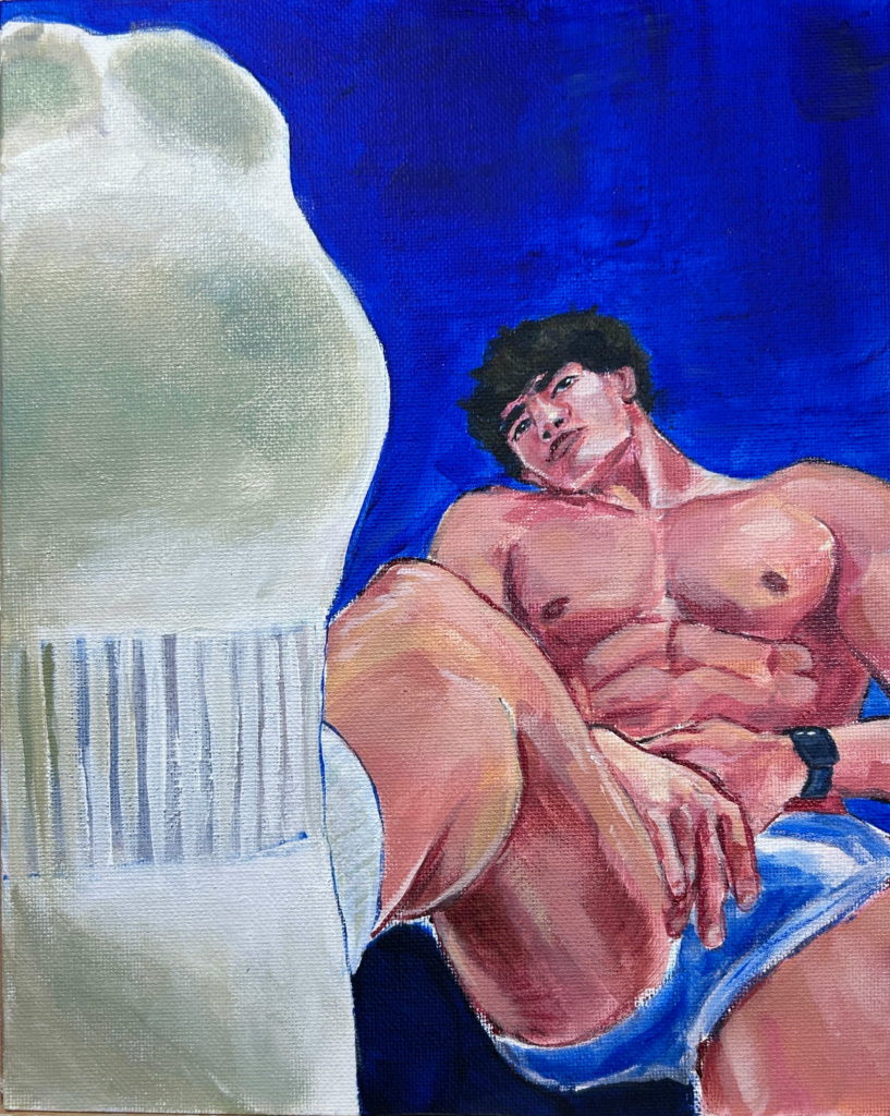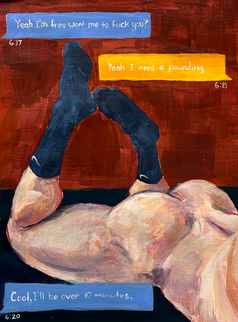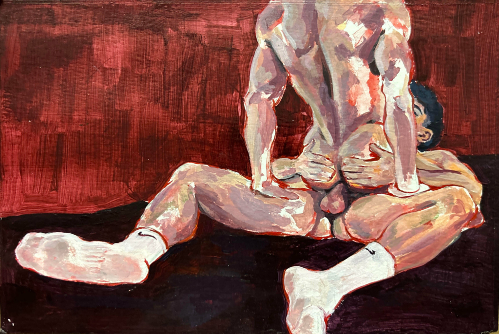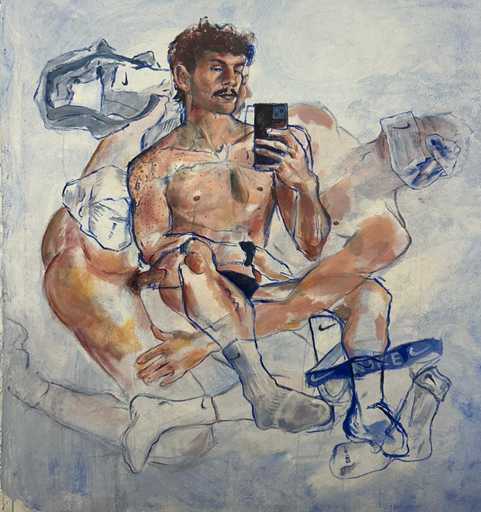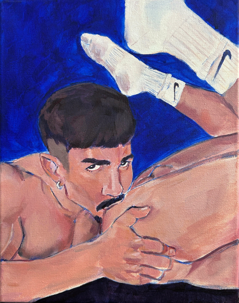 Mi affascinano anche le domande che il mio lavoro solleva in me stesso: perché mi sento attratto dal rappresentare queste azioni sessuali e in che modo la cultura online — social media, pornografia, hook-up culture — influisce sulle comunità queer. Sono molto curioso di vedere dove mi porteranno queste domande e come si svilupperà il mio lavoro nel corso della mia carriera artistica.