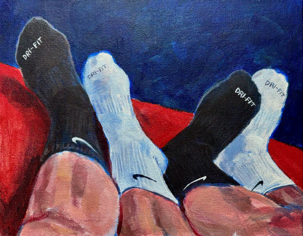Inizialmente erano calzini generici, ma il mio professore mise in discussione il genere della figura che stava assumendo il ruolo passivo; in qualche modo, l’aggiunta dello swoosh Nike sui calzini rese assolutamente chiaro che si trattava di un momento intimo tra due uomini.