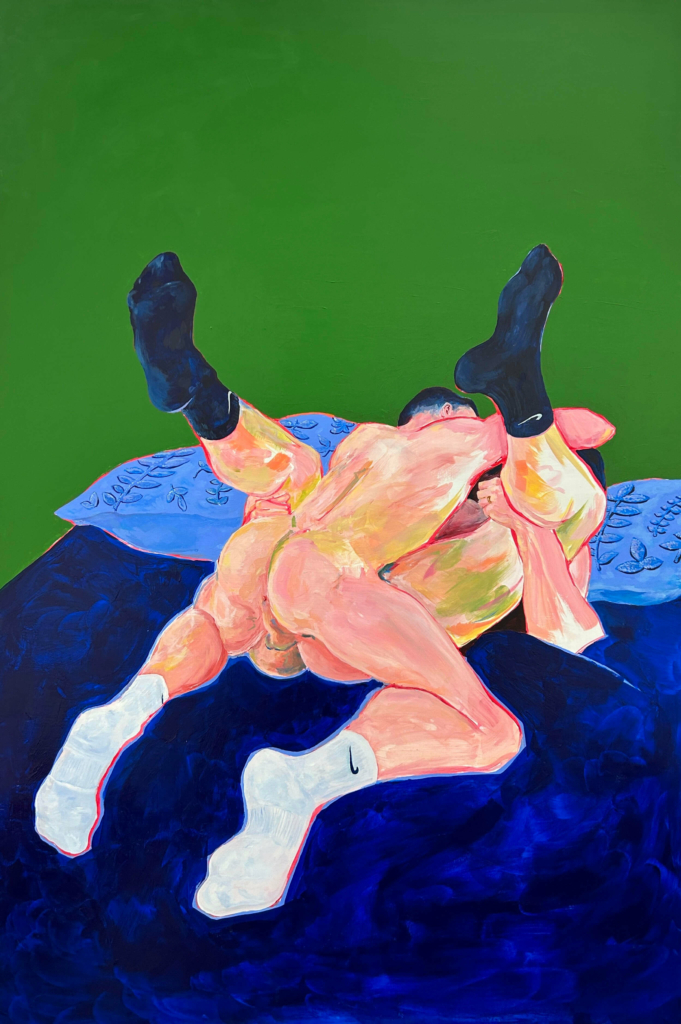 Lavorando con la figurazione, Ivy usa la mascolinità come linguaggio visivo e politico — piegandola, rendendola permeabile, lasciandola scoperta. Nei suoi dipinti, l’intimità è sempre attraversata da una tensione sottile tra controllo e vulnerabilità: lo sguardo diretto delle figure, il corpo come superficie esposta e dettagli ricorrenti — come i calzini bianchi Nike, segno ironico e feticcio quotidiano — trasformano lo spettatore da osservatore a presenza coinvolta.