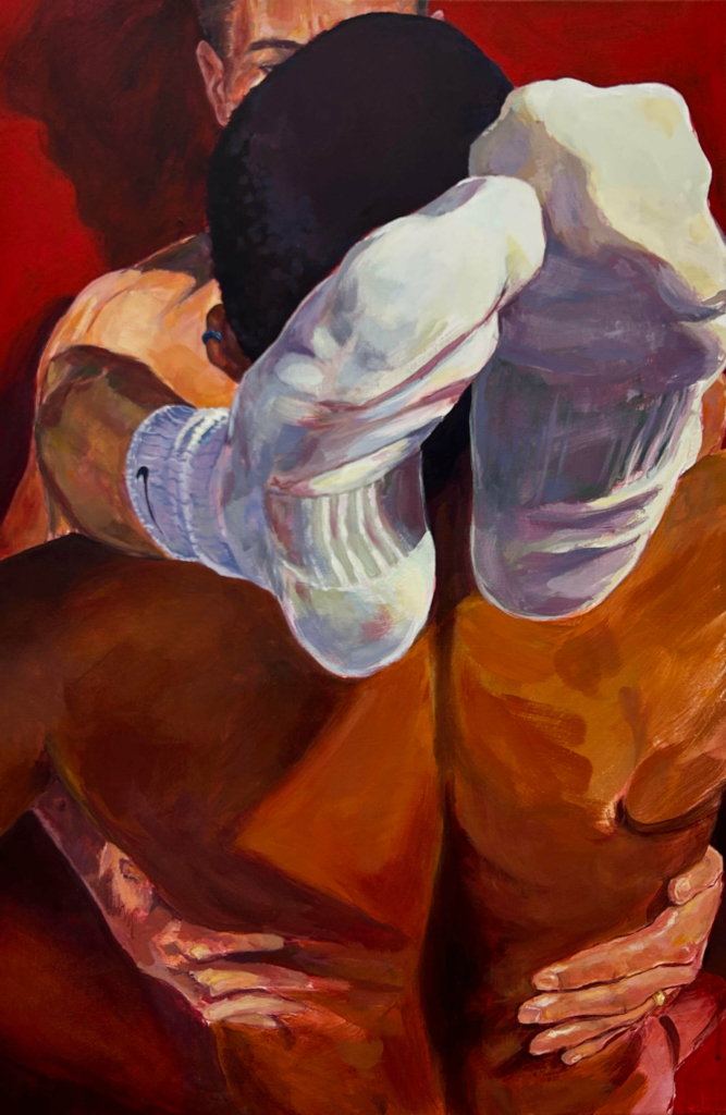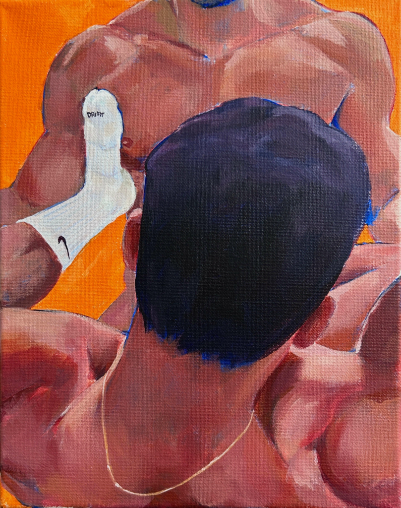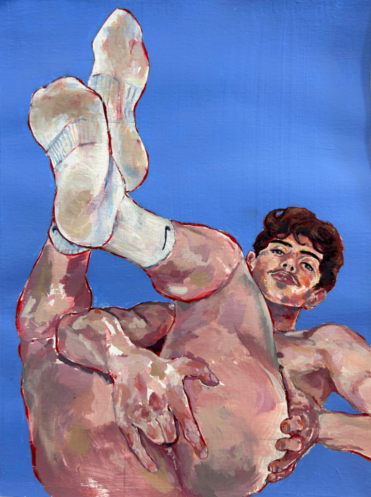 L’aggiunta dei calzini è anche legata all’umorismo da spogliatoio del tipo “non è gay se tieni i calzini”, e volevo appropriarmi di quella battuta. Col tempo ho imparato ad amare il processo di resa pittorica dei calzini insieme ai corpi nudi: adoro il contrasto tra il tessuto morbido e la carne.